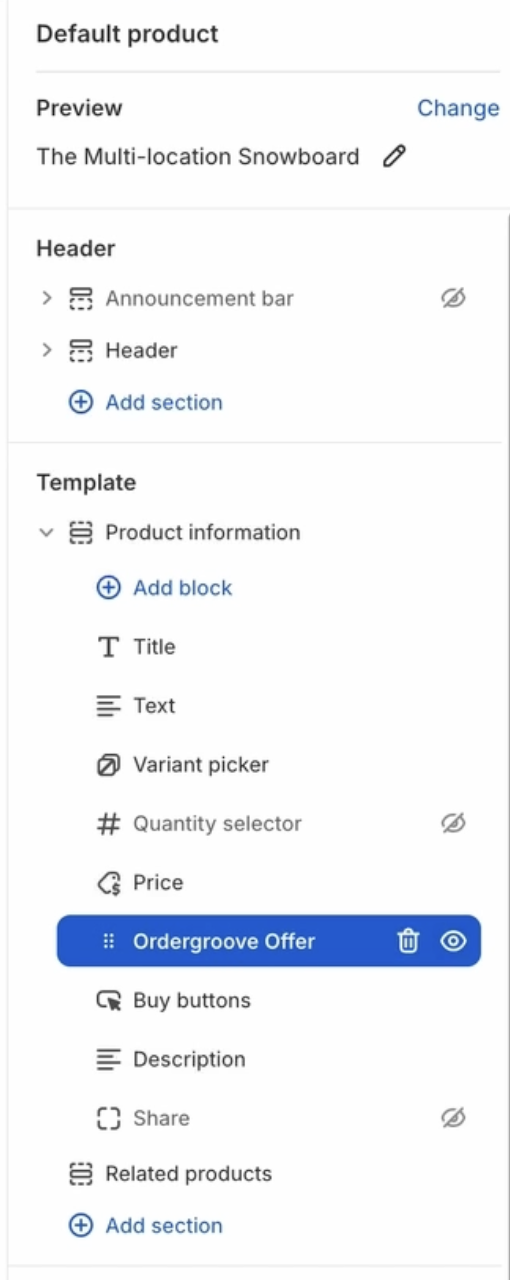 Back in Ordergroove, click Next to go to the Customize page. Click Customize. This will take you back to Shopify. Under Template > Product Information, click and drag Ordergroove Offer beneath Price. Click Save and close the tab.
