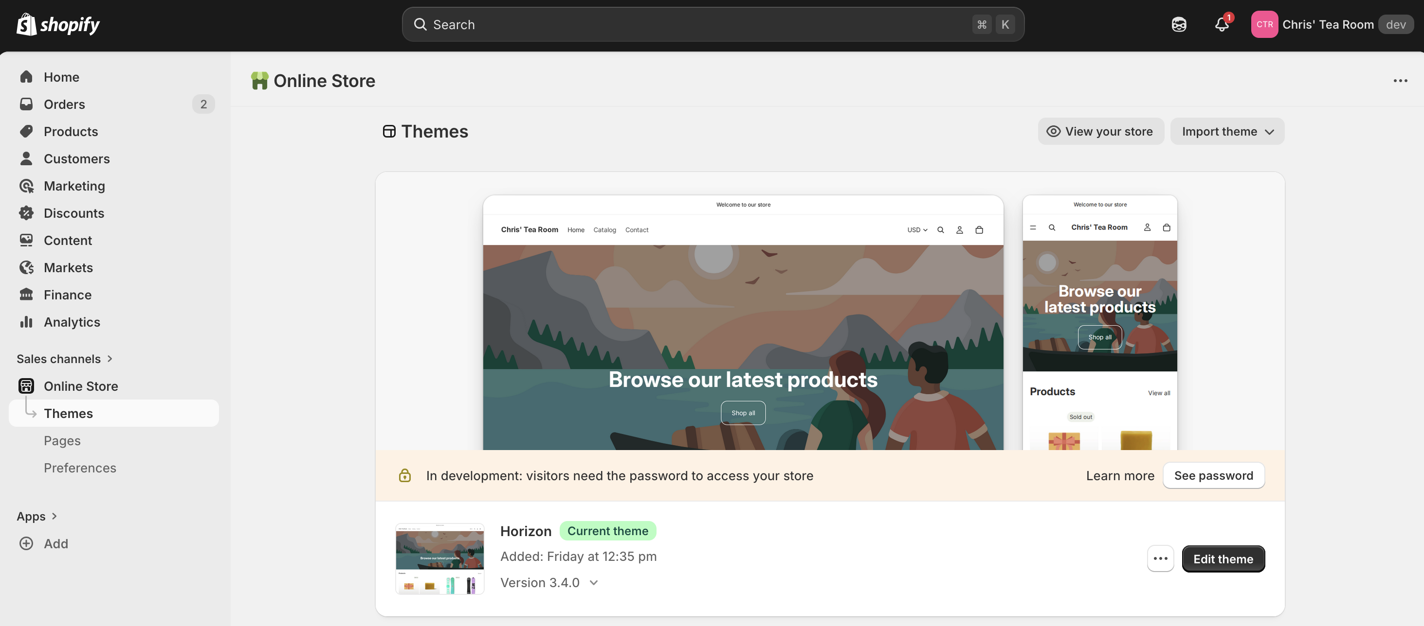 When you create a store with test data, Shopify creates a new test data theme. We want the original Horizon theme, so let's change it back: