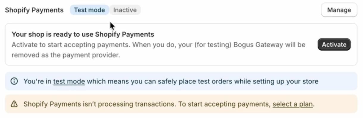 Shopify enables a Bogus Gateway by default. This gateway can't place orders, so let's change that. Click Switch to Shopify Payments, and fill out the form.