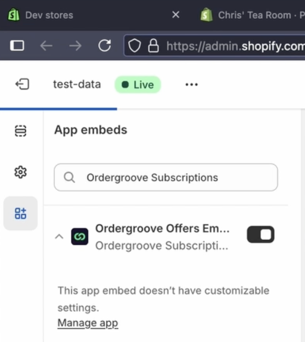 On the App Embed page, click Configure. It'll open a new tab redirecting you back to your Shopify Store. Make sure Ordergroove Offers Embed is checked off. Then hit Save and close the tab.