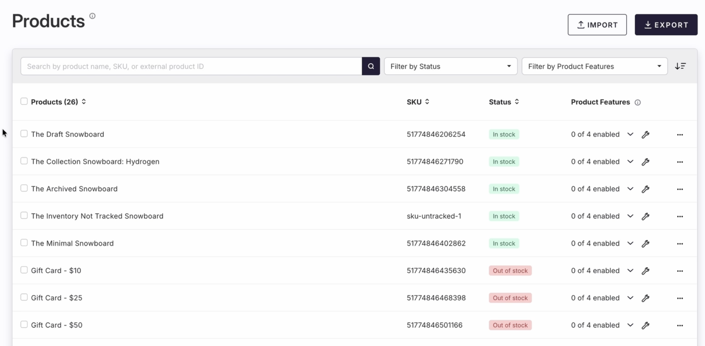 Before we head back to Shopify, first let's make sure Ordergroove has all of the sample Shopify products available. In Ordergroove, go to Data > Products. You should see the list of Shopify sample products. If you don't see any products yet, give it 5-10 minutes and refresh the page. The speed can vary depending on how fast Shopify responds to us.