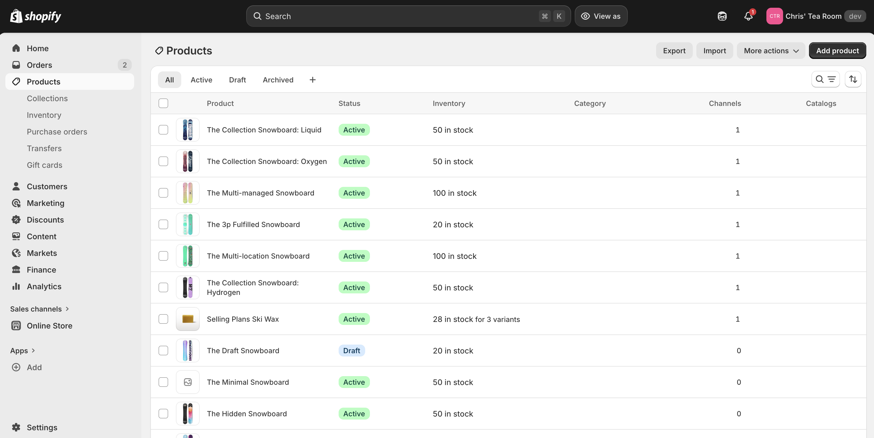 With the new store created, go to Products and double check that the test products have loaded in. It just takes a few seconds, so if you don't see any products yet refresh the page.