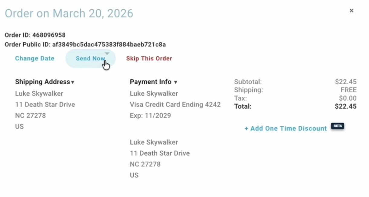 Ordergroove will display the Order Details, and you'll see a few options including Send Now. Click Send Now to send the order to Shopify for placement.