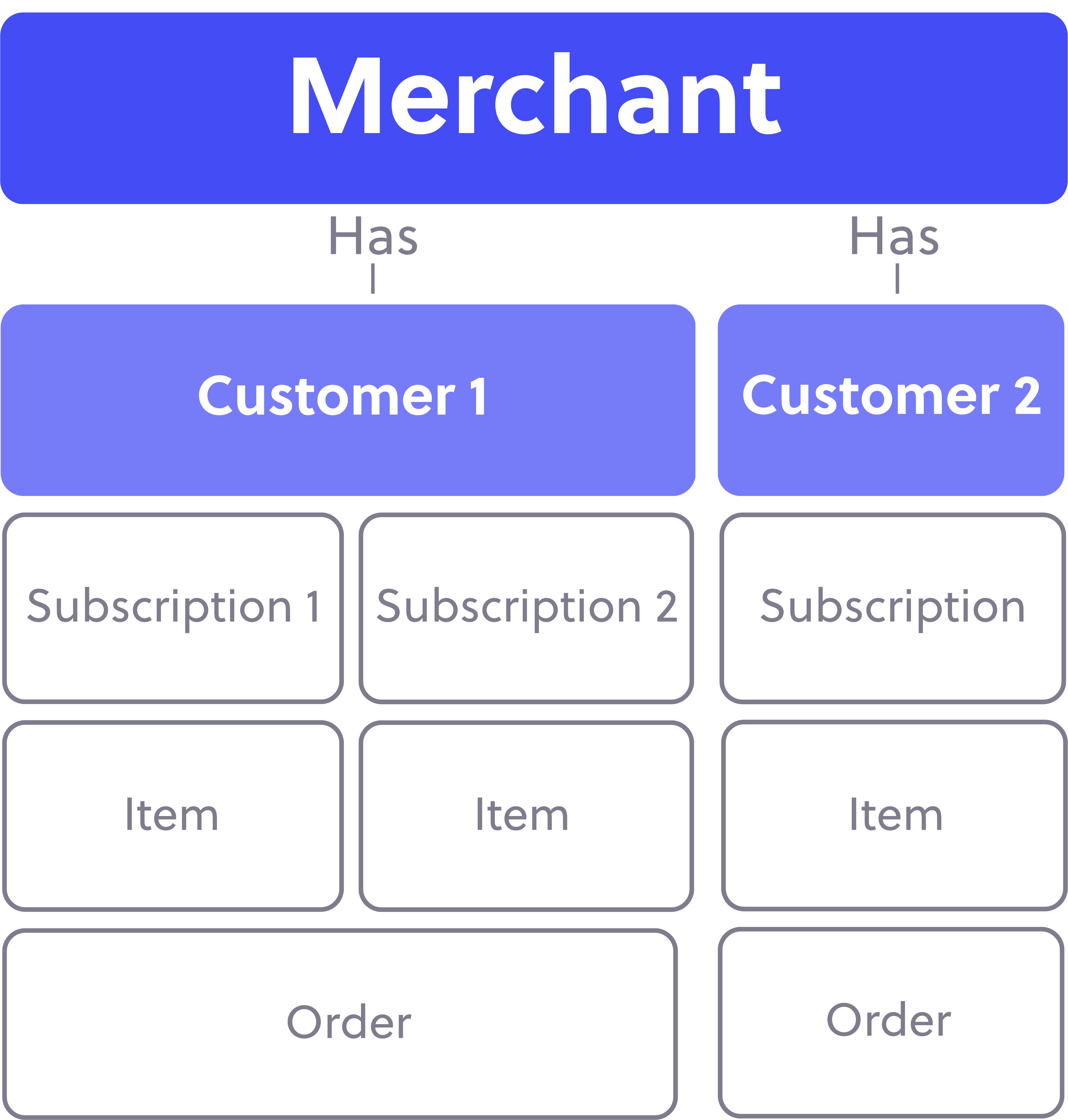 Our data model centers on four core objects: Customer, Subscription, Item, and Order. This diagram illustrates how subscriptions generate items and orders over time. Note that Ordergroove only creates the next upcoming order, subsequent orders are created as necessary.